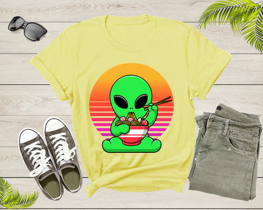 Cute Alien Mascot Eating Japanese Ramen Noodle Retro Sunset T-Shirt UFO Alien Lover Gift Shirt for Men Women Kids Boys Girls Graphic TShirt