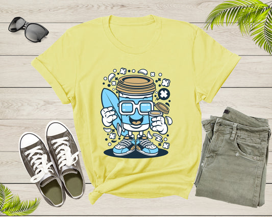 Happy Blue Coffee Cup Surfer with Sunglasses Holding Coffee T-Shirt Surf Coffee Lover Gift T Shirt for Men Women Kids Boys Girls Tshirt