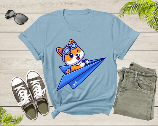 Blue Paper Plane Flying Happy Cute Dog With Pilot Goggles T-shirt Dog Puppy Plane Shirt For Men Women Kids Boys Girls Teens Dog Lover Tshirt